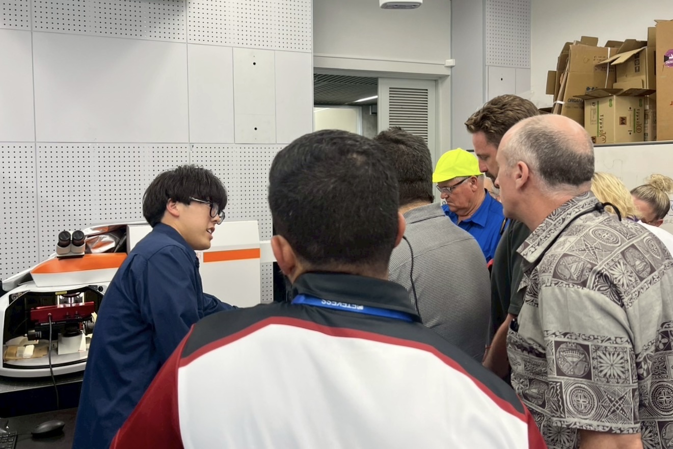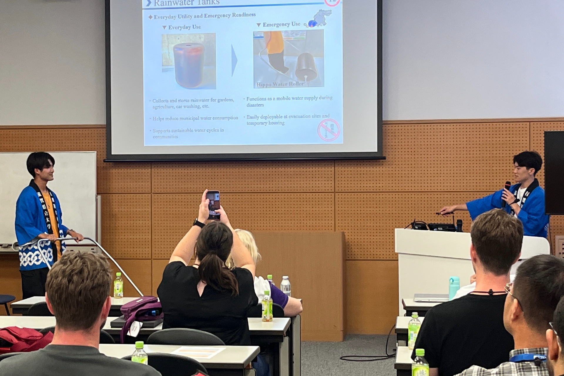 当日は、私たちの活動や雨水タンクの開発について英語で紹介し、活発な意見交換を行うことができました。さらに研究室見学も実施し、機器の説明にも挑戦しました。慣れない英語での対応ではありましたが、海外からの参加者の皆さまに理解を深めていただけたことを大変うれしく思います。